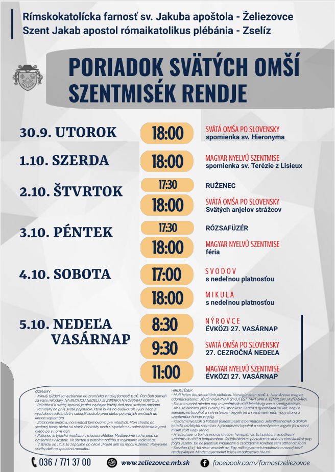 • Začíname prípravu na sviatosť birmovania pre mladých, ktorí chodia do siedmej triedy alebo sú starší. Prihlášky nech si vyzdvihnú v sakristii kostola pred alebo po sv. omšiach.