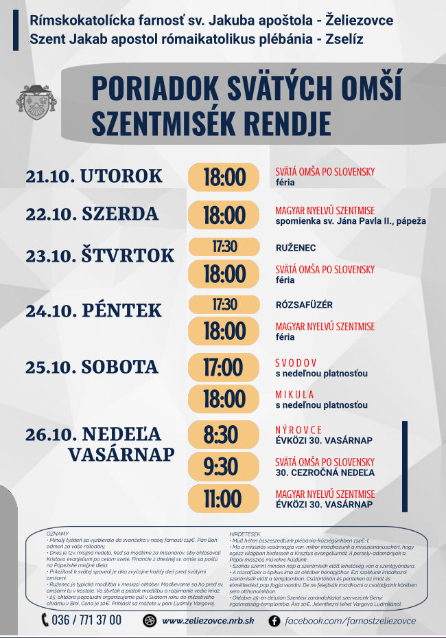 • Dnes je tzv. misijná nedeľa, keď sa modlíme za misonárov, aby ohlasovali Kristovo evanjelium po celom svete. Financie z dnešnej sv. omše sa pošlú na Pápežské misijné diela.