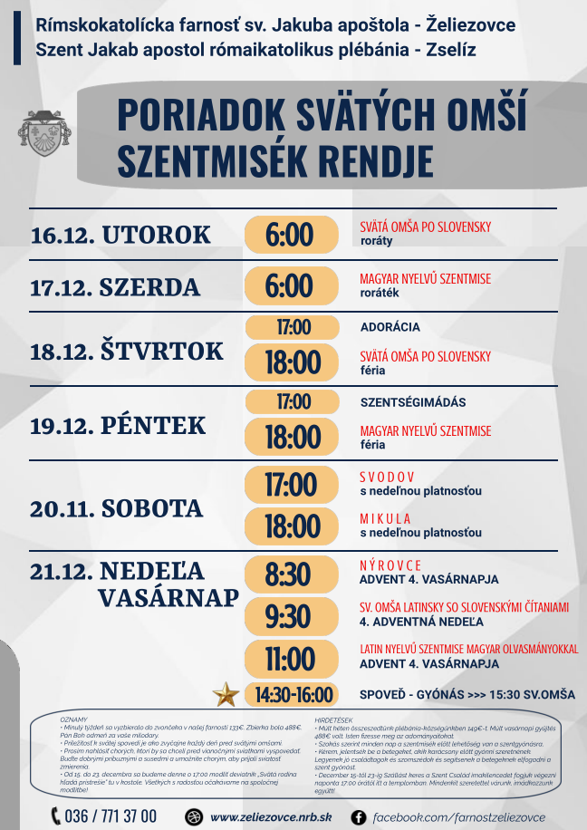 • Prosím nahlásiť chorých, ktorí by sa chceli pred vianočnými sviatkami vyspovedať. Buďte dobrými príbuznými a susedmi a umožnite chorým, aby prijali sviatosť zmierenia.