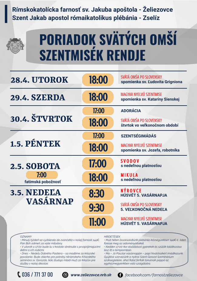 • Dnes – Nedeľu Dobrého Pastiera – sa modlíme za kňazské povolania. Bude zbierka pre potreby nitrianskeho Kňazského seminára sv. Gorazda, kde študujú mladí muži za kňazov pre službu v našej diecéze.
