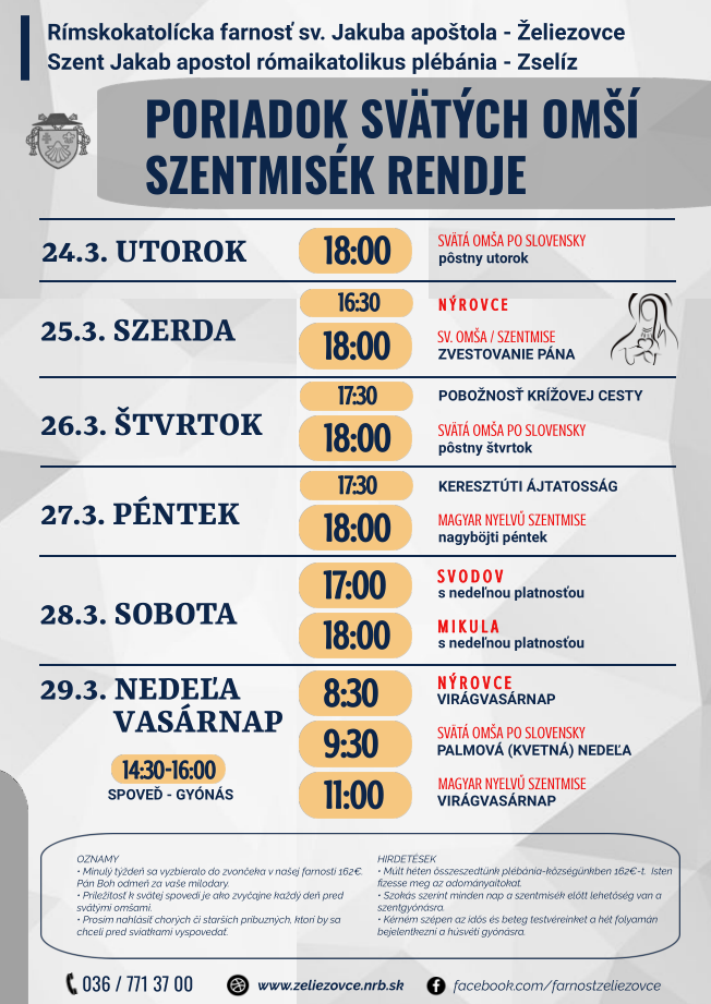 Príležitosť k predveľkonočnej svätej spovedi bude bude vo farskom kostole od 14:30 do 16:00.