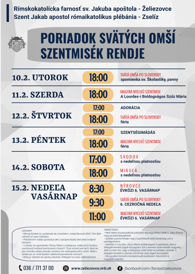 • V stredu na spomienku Panny Márie Lurdskej po svätej omši budem vysluhovať sviatosť pomazania chorých. Tá je určená pre tých, ktorí sa pre chorobu alebo starobu dostanú do nebezpečenstva smrti. Teda v stredu po sv. omši budem udeľovať pomazanie chorých.